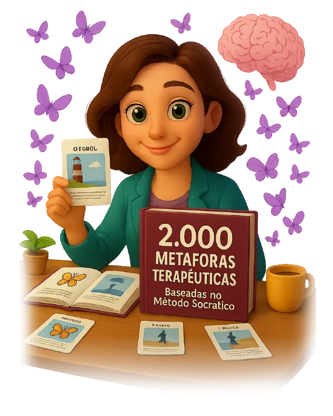 As 2000 metáforas estão divididas por temas terapêuticos e vem com: Narrativa simbólica Mensagem central Perguntas socráticas Exercício prático